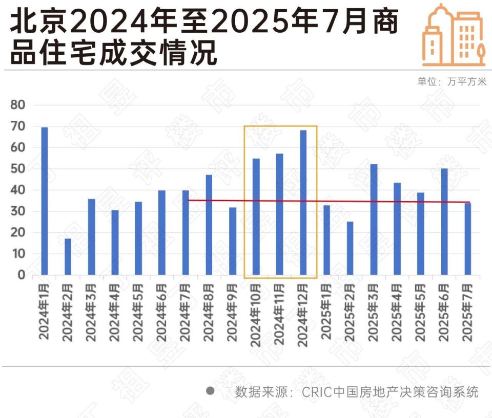 聚焦到北京来看2024年10月,受9月政策利好推动全市成交环比大涨73.3%,随后一直到2024年底整体成交保持上涨,进入2025年后,经历了1-2月春节淡季后3月又再次提升,但2025年二季度后,增长动能明显不足,7月北京全市成交商品住宅33.92万平方米,较2024年同期下降14.6%。