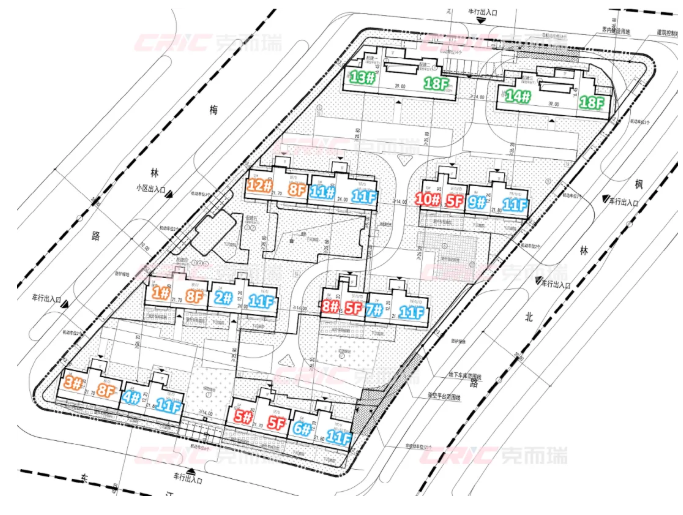 规划显示,项目共14栋住宅,为小高与洋房的组合。