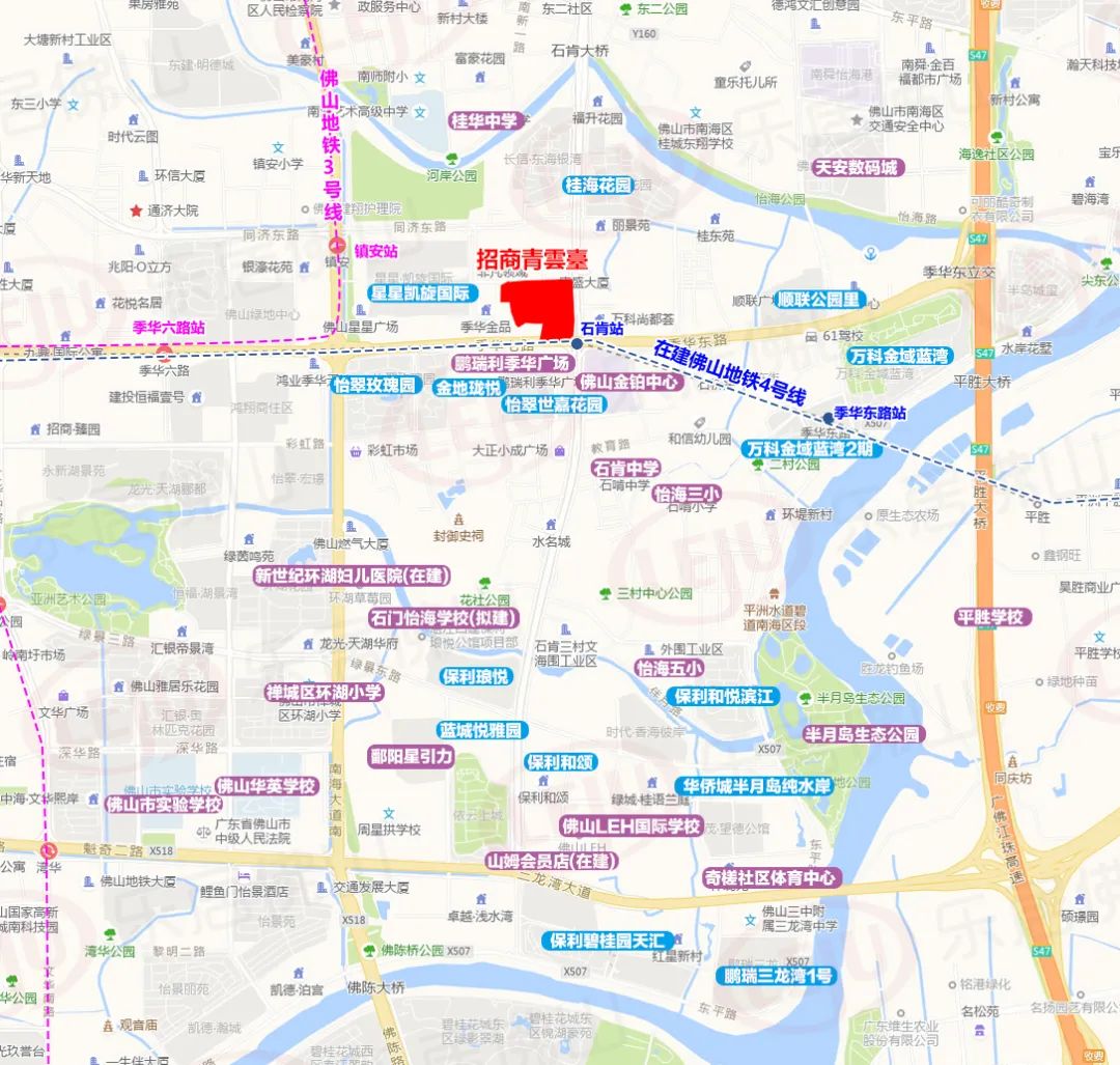 从地图上看,招商青雲臺位于禅桂交界石肯板块,地处季华七路之上,同时也是佛山地铁4号线石肯站(待建)上盖,周边已开发有季华金品、星星凯旋国际、怡翠玫瑰园、怡翠世嘉花园、金地珑悦等住宅项目。