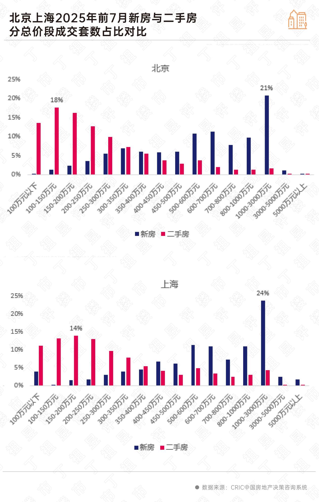 CRIC数据显示,前7月京沪300万元以下低总价段二手房源成交套数占比均超过60%,而新房成交主力价格区间为1000-3000万元,占比分别为21%和24%,其次是500-700万元占比都在约22%左右。