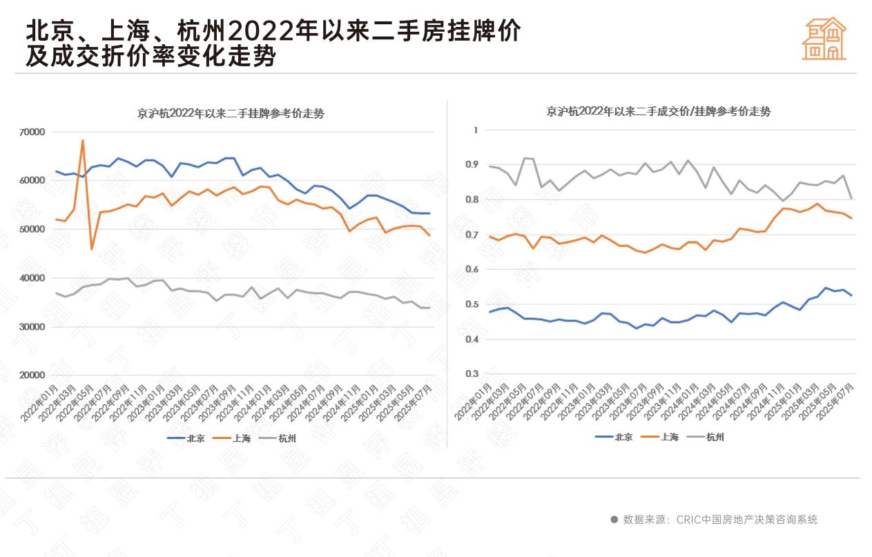 具体来看,北京和上海二手房挂牌价高点出现在2023年底和2024年初,杭州调整高点出现在2022年底,在达到高点后,二手房挂牌价均逐月下行且跌幅扩大,至今年7月,三城二手房挂牌价均到了最低点,平均挂牌价较高点时分别下行17.6%、17.1%和15%。