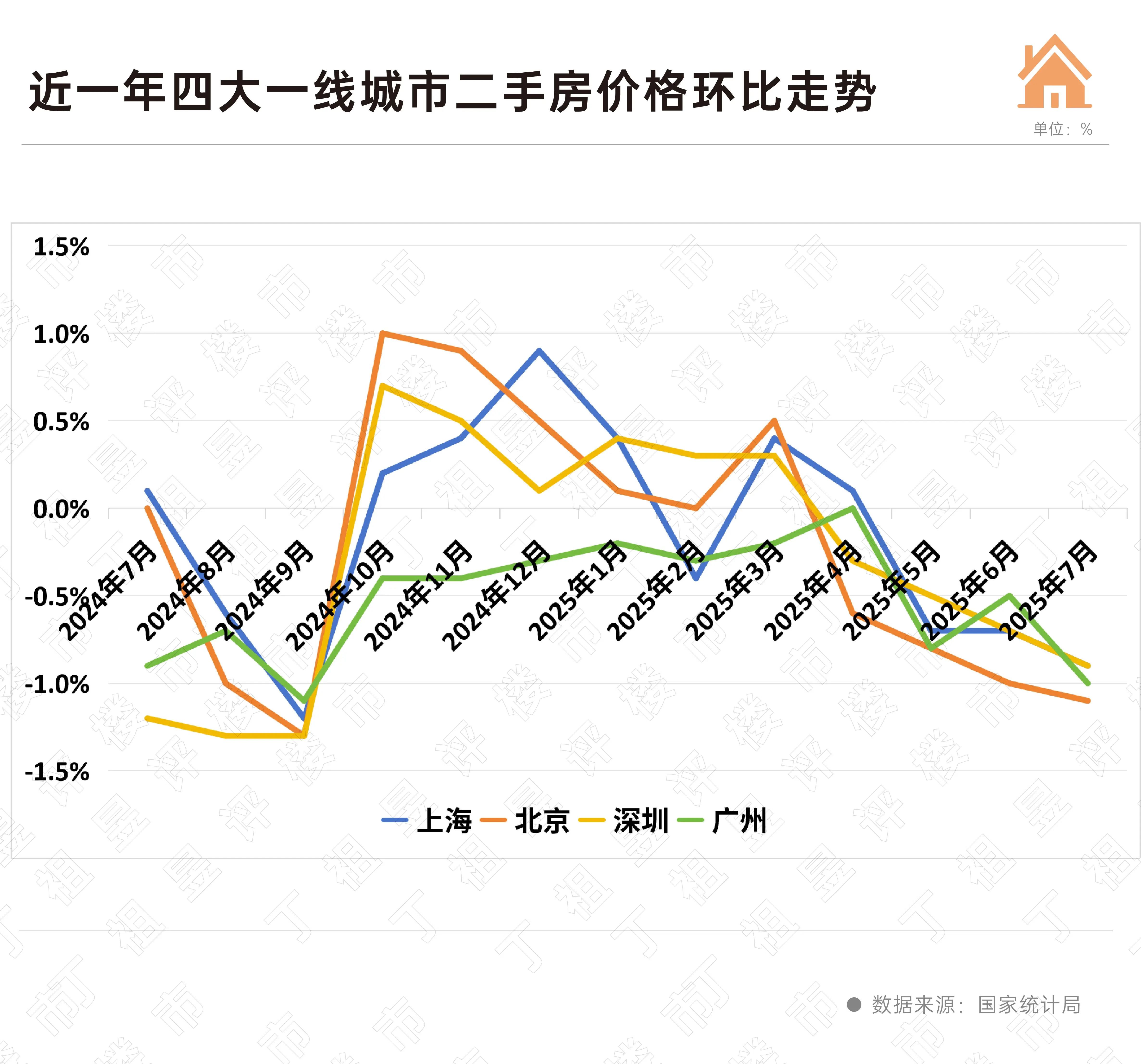 此外,一线城市二手房价环比下降1.0%,降幅比上月扩大0.3个百分点。其中,北京、上海、广州和深圳分别下降1.1%、0.9%、1.0%和0.9%,环比跌幅创2024年10月以来最低。