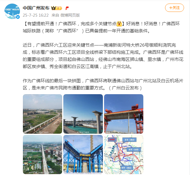 03.广佛环线有望提前一年贯通近日,据中铁广投消息,经地铁集团初评,广佛西环已具备提前一年开通的基础条件。