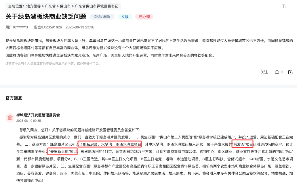 日前,有网友在领导留言板咨询关于绿岛湖板块商业缺乏问题,禅城经济开发区管理委员会作出了答复。