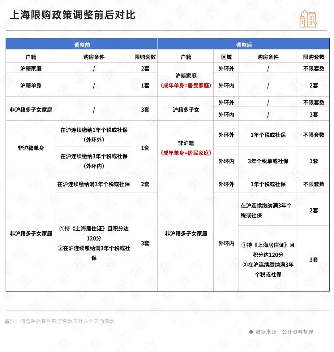 二是成年单身人士按照居民家庭执行住房限购政策。也就是说,户籍单身人士可在外环内购买2套住房,非户籍单身社保满3年在外环内限购1套,外环外社保满一年单身人士也不限套数。