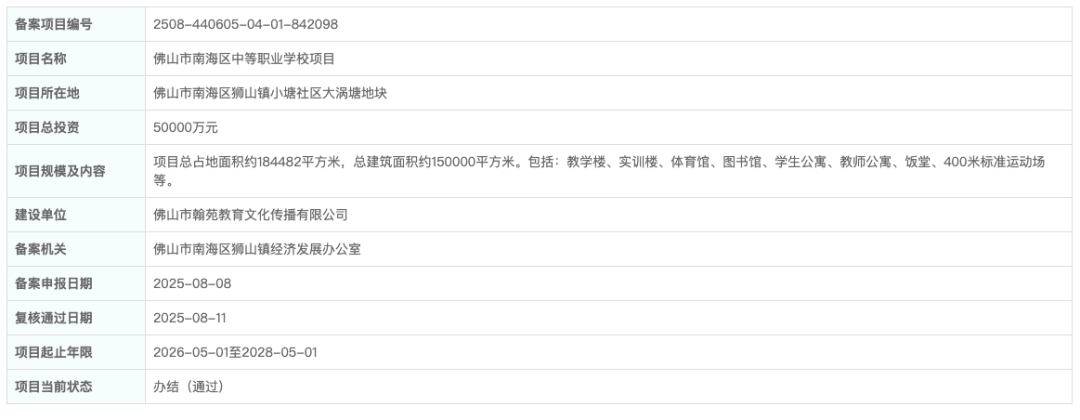 随后不久的8月,佛山市南海区中等职业学校项目也正式备案,将投资5个亿新建职校。