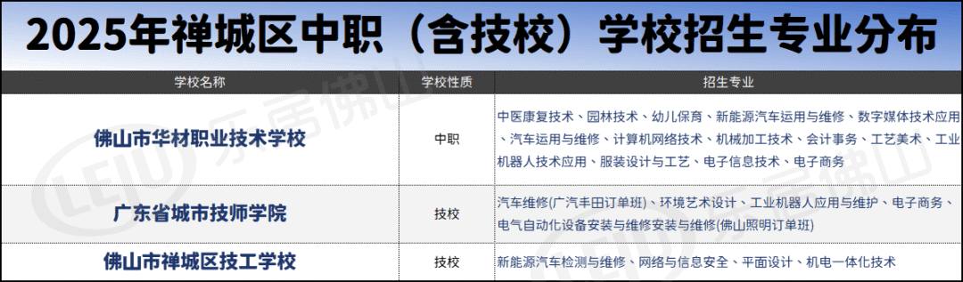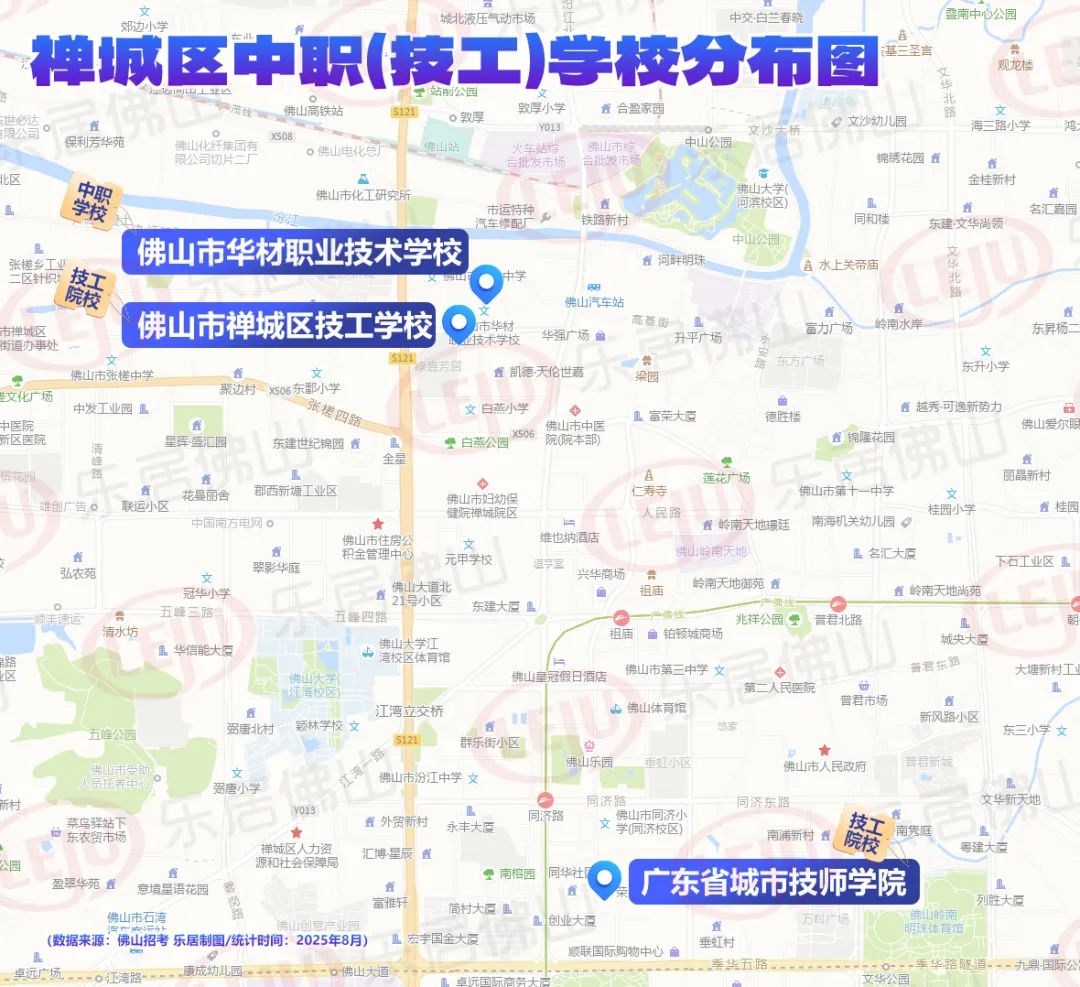 据乐居梳理统计,禅城共有三所中职(技工)类学校,包括1所中职和2所技校,其中两所分布在祖庙佛山汽车站附近,还有一所则位于同济路附近。