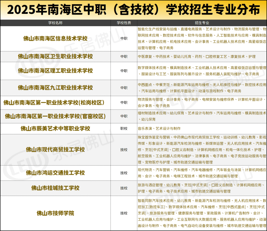 南海方面,共开设有中职(技工)类学校总计11家,包括4家技校和7家中职,以狮山居多。