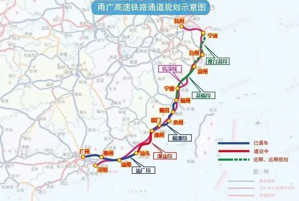 项目建成通车后,温州至福州的高铁运行时间将从现在的最快2小时缩短至约1.5小时,甬广高铁全线通车以后,杭州至深圳(经宁波)将从现在经杭深线的平均10个小时缩短至最快约6.5小时左右。