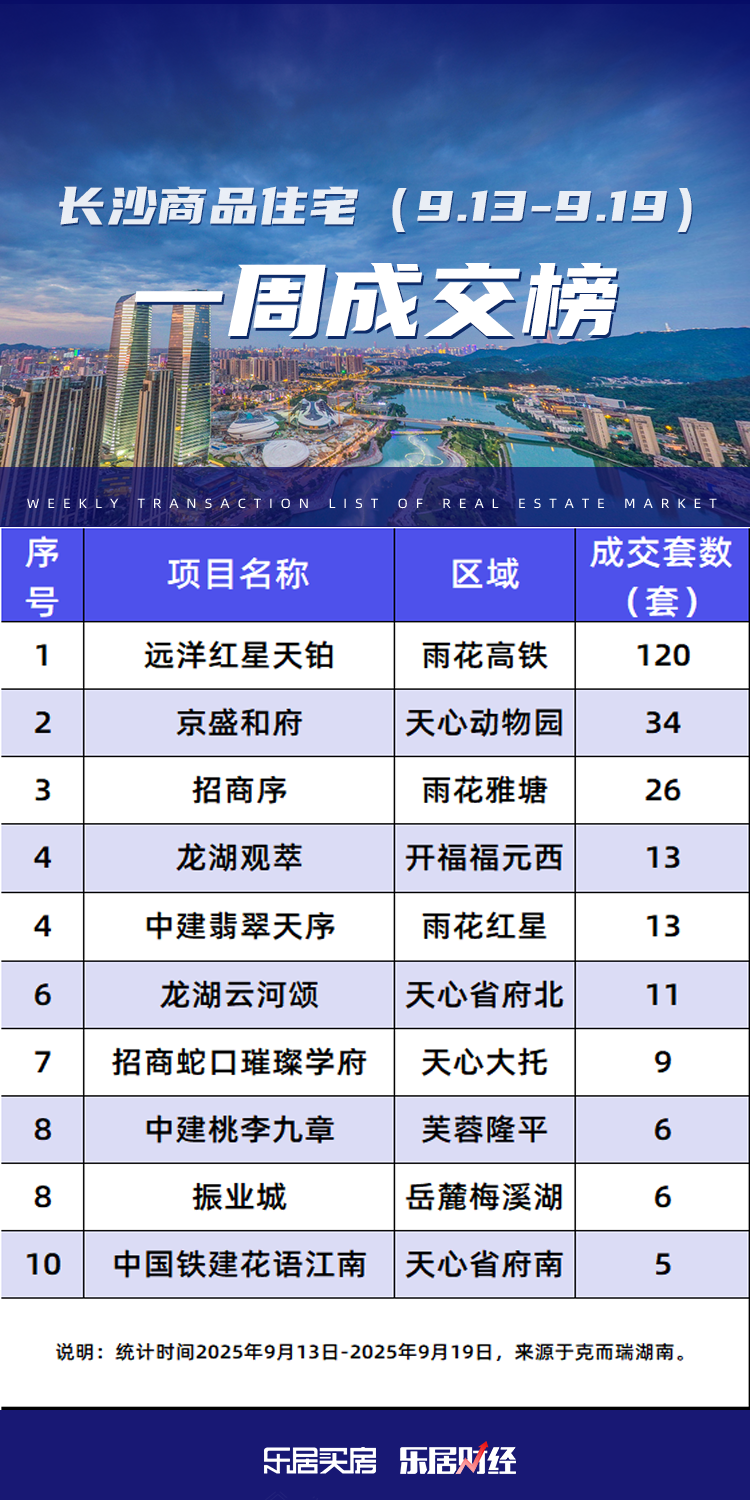 其中位于榜单前三位的分别为雨花区高铁板块的远洋红星天铂、开心区动物园的京盛和府、开福区福元西的招商序龙湖观萃,分别成交120套、34套、26套。