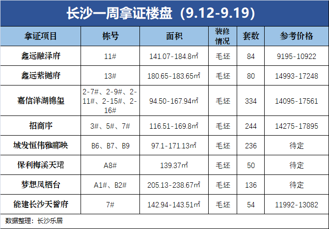 新房供应方面,根据长沙市住建局官网信息及克而瑞湖南统计显示,上周(9.13-9.19)内五区新增供应房源1218套,共计18.57万方。有8项目拿证,具体情况如下图: