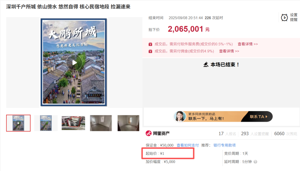 比如深圳大鹏新区的千户所城独栋住宅,建筑面积290平方米,实际使用面积约320平方米,经过267次竞拍后以206.5万元成交。