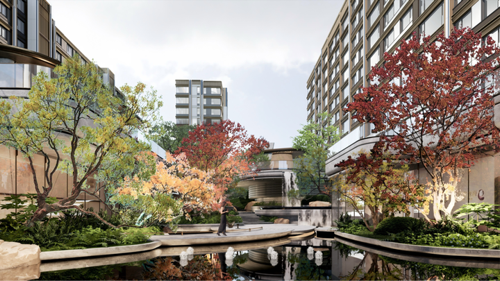 项目以山海为核,建筑立面取意山形水韵,以石材与金属的肌理对话自然;园林设计融入长物美学,在九章园景中复现文人雅趣;更匠心打造约1800㎡共享空间,涵盖运动、休闲等多元场景,让生活场景无限延展。