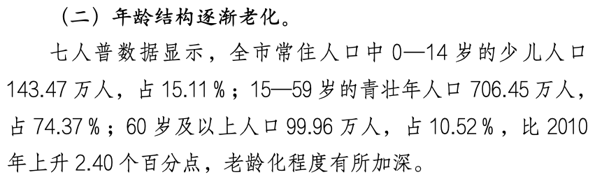 此外,数据还显示,全市常住人口中0—14岁的少儿人口143.47万人,占15.11%;15—59岁的青壮年人口706.45万人,占74.37%;60岁及以上人口99.96万人,占10.52%,比2010年上升2.40个百分点,老龄化程度有所加深。