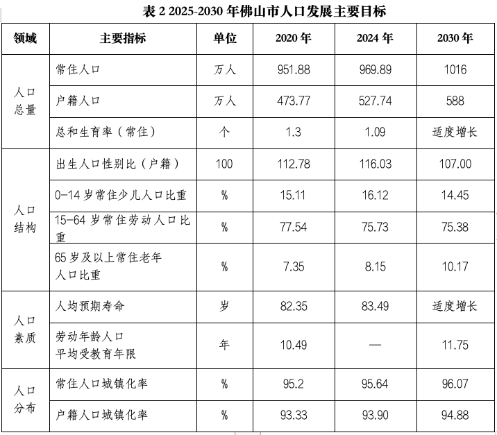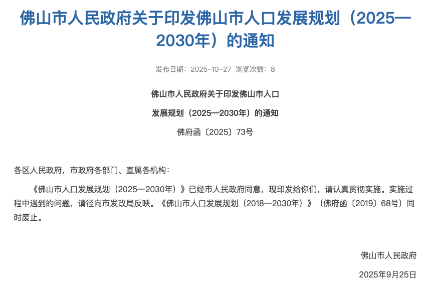 常住人口破千万!未来再增60万人!佛山首份“十五五”规划出炉!10月27日,佛山市人民政府发布了《关于印发佛山市人口发展规划(2025—2030年)的通知》,对佛山市人口现状进行了分析并对未来发展方向做出了指引。