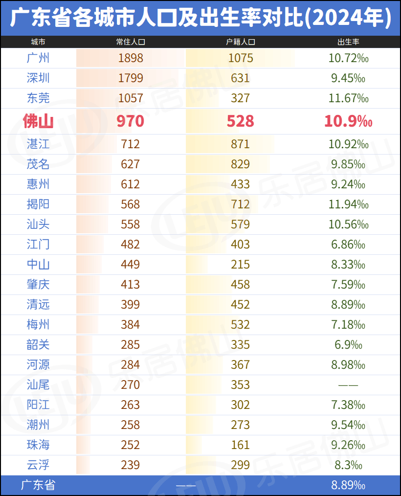 其中,佛山2024年的出生率为10.9‰,高于广东省8.89‰的平均水平,略低于揭阳、东莞和湛江三大城市。