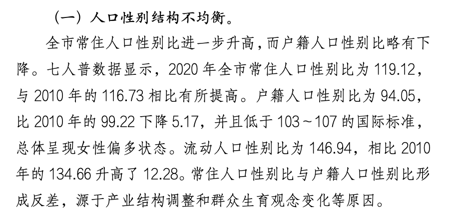 报告指出,常住人口性别比与户籍人口性别比形成反差,源于产业结构调整和群众生育观念变化等原因。