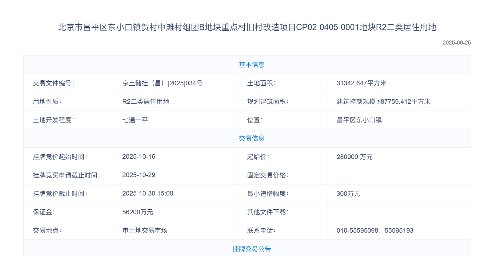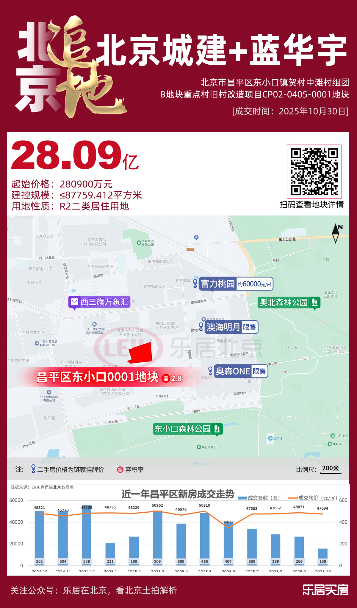 10月30日,备受瞩目的昌平区东小口镇贺村中滩村组团B地块重点村旧村改造项目CP02-0405-0001地块竞价截止,仅一家报名并报价,最终北京城建投资发展股份有限公司和北京蓝华宇房地产开发有限公司联合体以28.09亿元底价成交,楼面价约3.2万元/㎡。