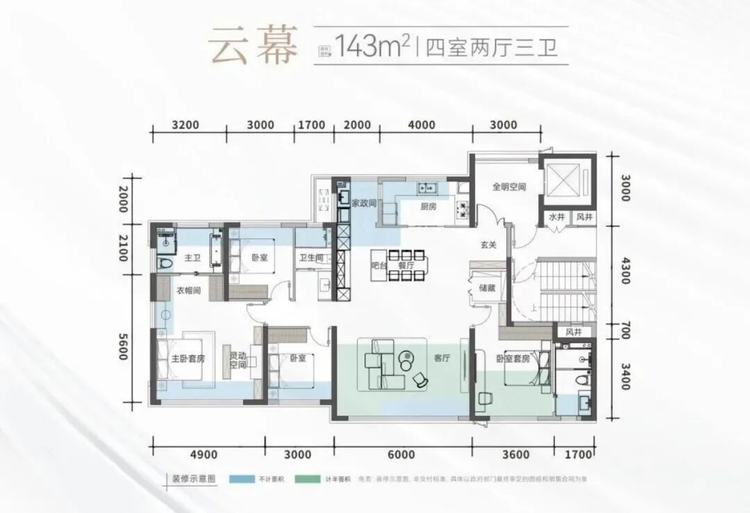 如果说配套是基础,那么产品力就是中交瑞启芙蓉的核心竞争力。项目首推建面约143㎡四房两厅三卫毛坯住宅,得房率高达112%(含私梯厅),套内实得面积约160㎡,实现“负公摊”效应。