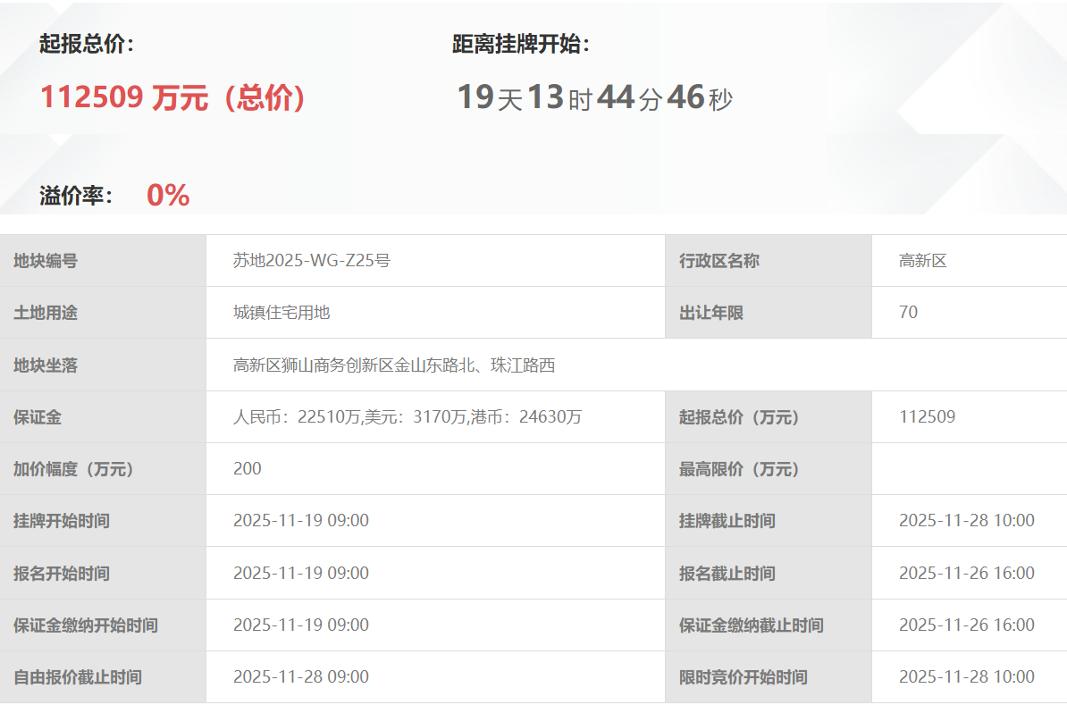 苏地2025-WG-Z25号位于狮山商务创新区金山东路北、珠江路西,出让面积48080.9㎡,城镇住宅用地,容积率1.3。起拍总价112509万元,起拍楼面价约18000元/㎡。