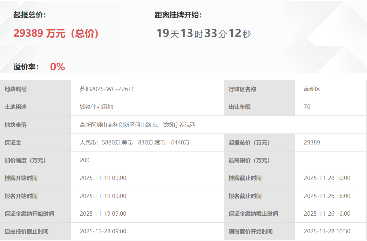 另一宗,苏地2025-WG-Z28号位于高新区狮山商务创新区何山路南、陇枫疗养院西,出让面积16006.9㎡,城镇住宅用地,容积率1.02。起拍总价29389万元,起拍楼面价约18000元/㎡。