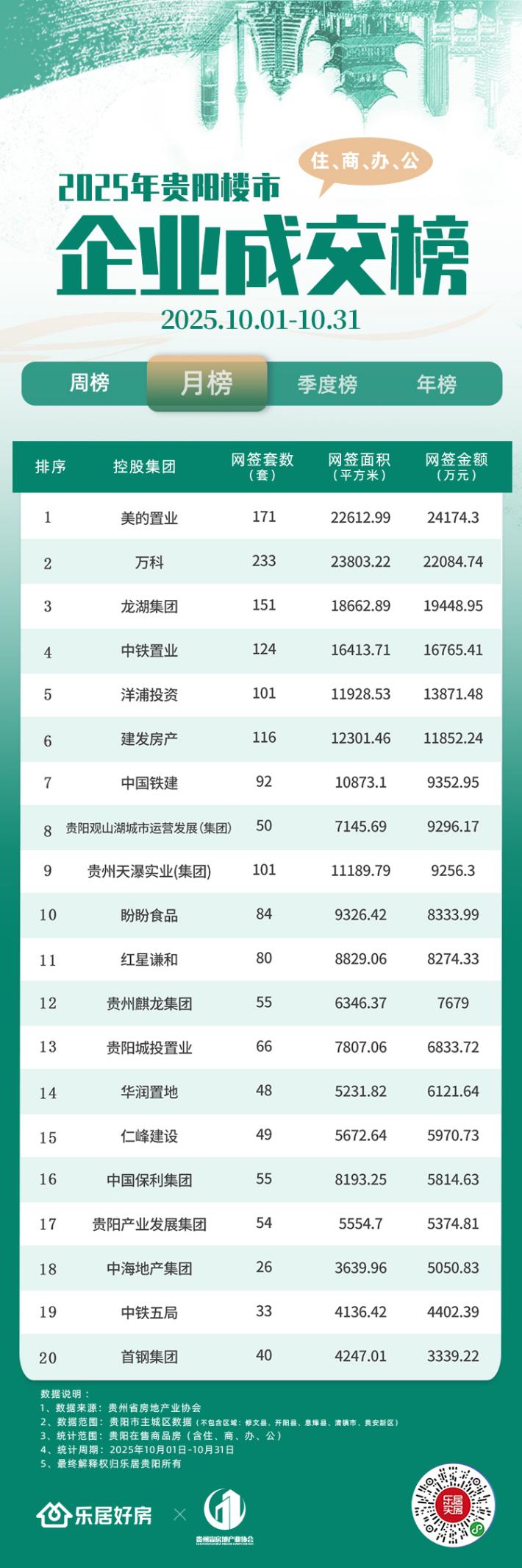 2025年11月3日,乐居贵阳站、贵州省房地产业协会联合发布《2025年贵阳楼市月度企业销售成交榜》。此次统计范围为贵阳市在售房企,统计周期为2025年10月1日—10月31日,榜单数据源于贵州省房地产业协会数据中心权威发布,维度为网签数据。