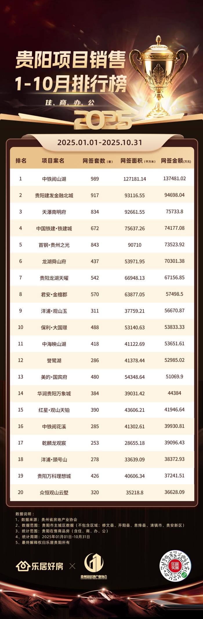 2025年11月3日,乐居贵阳站、贵州省房地产业协会联合发布《2025贵阳楼市1-10月项目成交榜》。此次统计范围为贵阳在售项目,统计周期为2025年1月1日-10月31日,榜单数据源于贵州省房地产业协会数据中心权威发布,维度为网签数据。