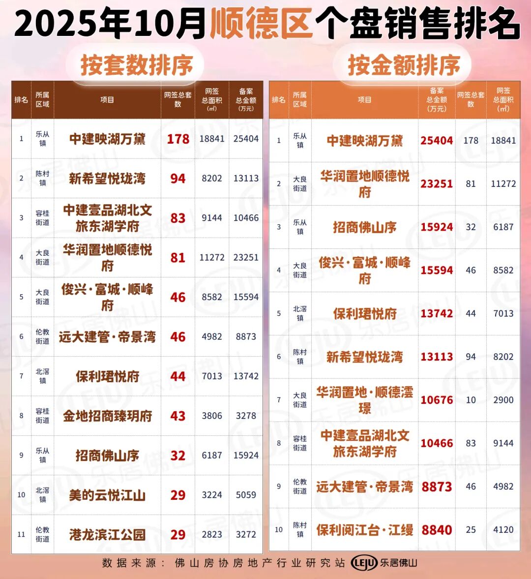 顺德区顺德方面,除了榜首的中建映湖万黛外,顺德套数成交前三的还有新希望悦珑湾和中建壹品湖北文旅东湖学府,金额前三的还有华润置地顺德悦府和招商佛山序。