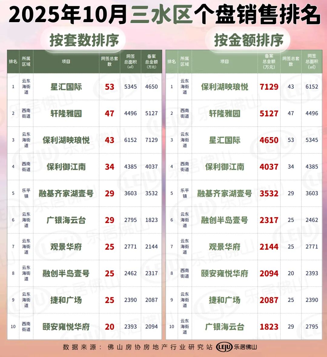三水区三水方面,网签套数最高的为位于三水新城的星汇国际;而网签金额最高的则为保利湖映琅悦。