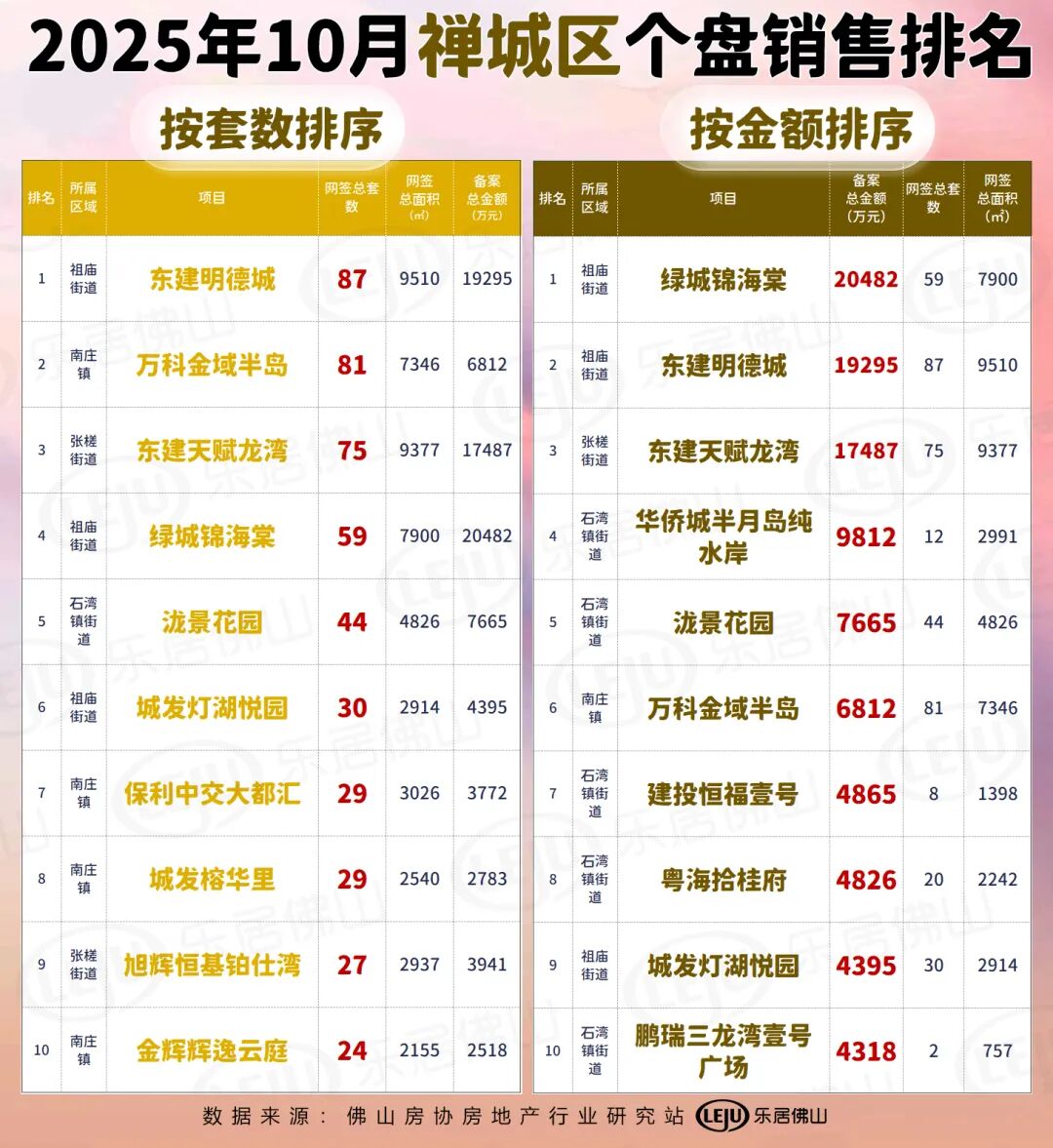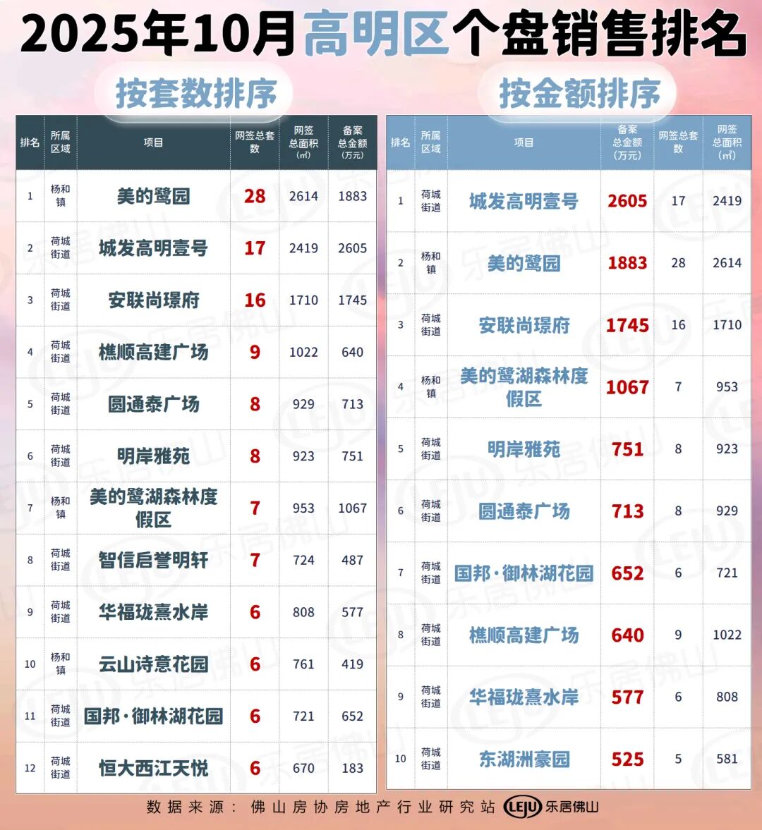 纵观10月套数前十项目来看,除了高明以外,其余四区均有盘打榜,且顺德和禅城居多,各占四席;而销售金额前十来看,也主要集中在禅城和顺德两区,南海仅有1盘上榜,为桂城的招商华玺。更多榜单详情请看↓