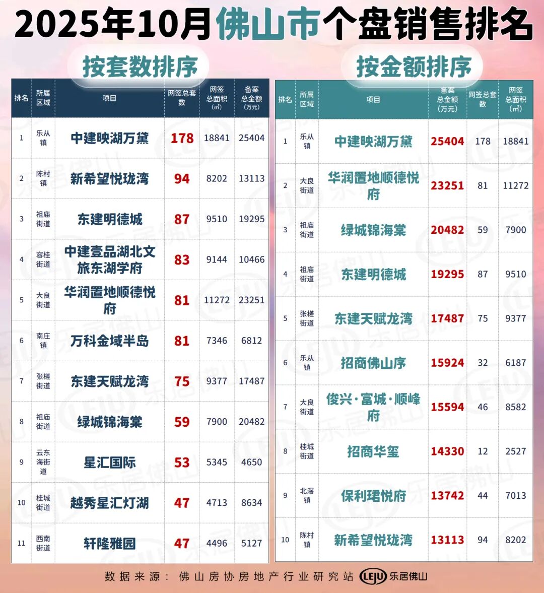 其中,套数榜位列前三的还有位于顺德陈村的新希望悦珑湾和禅城祖庙的东建明德城,分别网签94套和87套;而金额榜前三的则还有顺德大良的华润置地顺德悦府和禅城祖庙的首开新盘绿城锦海棠,分别网签2.33亿和2.05亿。