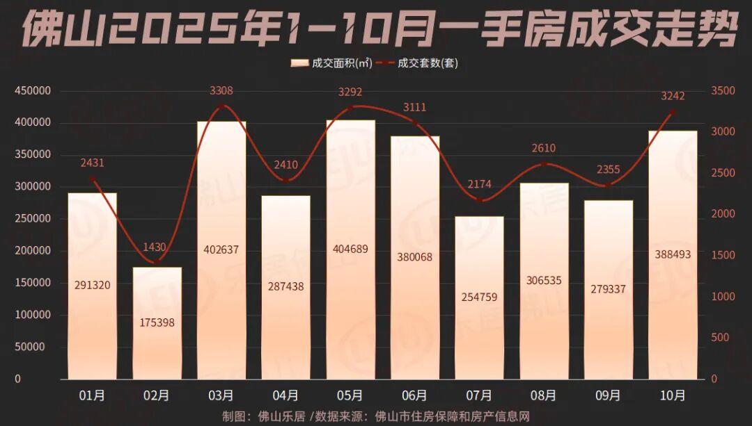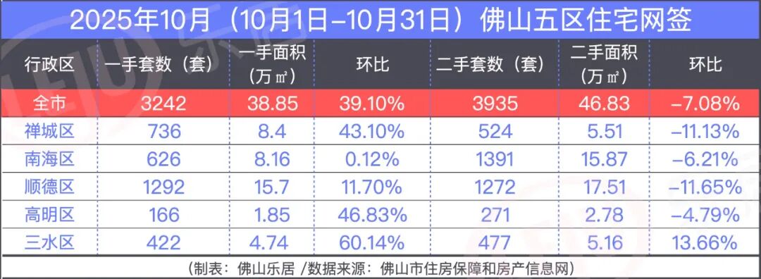 五区齐涨!佛山10月一手环涨4成随着多周数据的连连冲高,佛山10月也迎来了丰收。数据显示,佛山10月(10月1日-10月31日)共成交一手房3242套,网签面积约38.85万㎡,环涨39.1%。