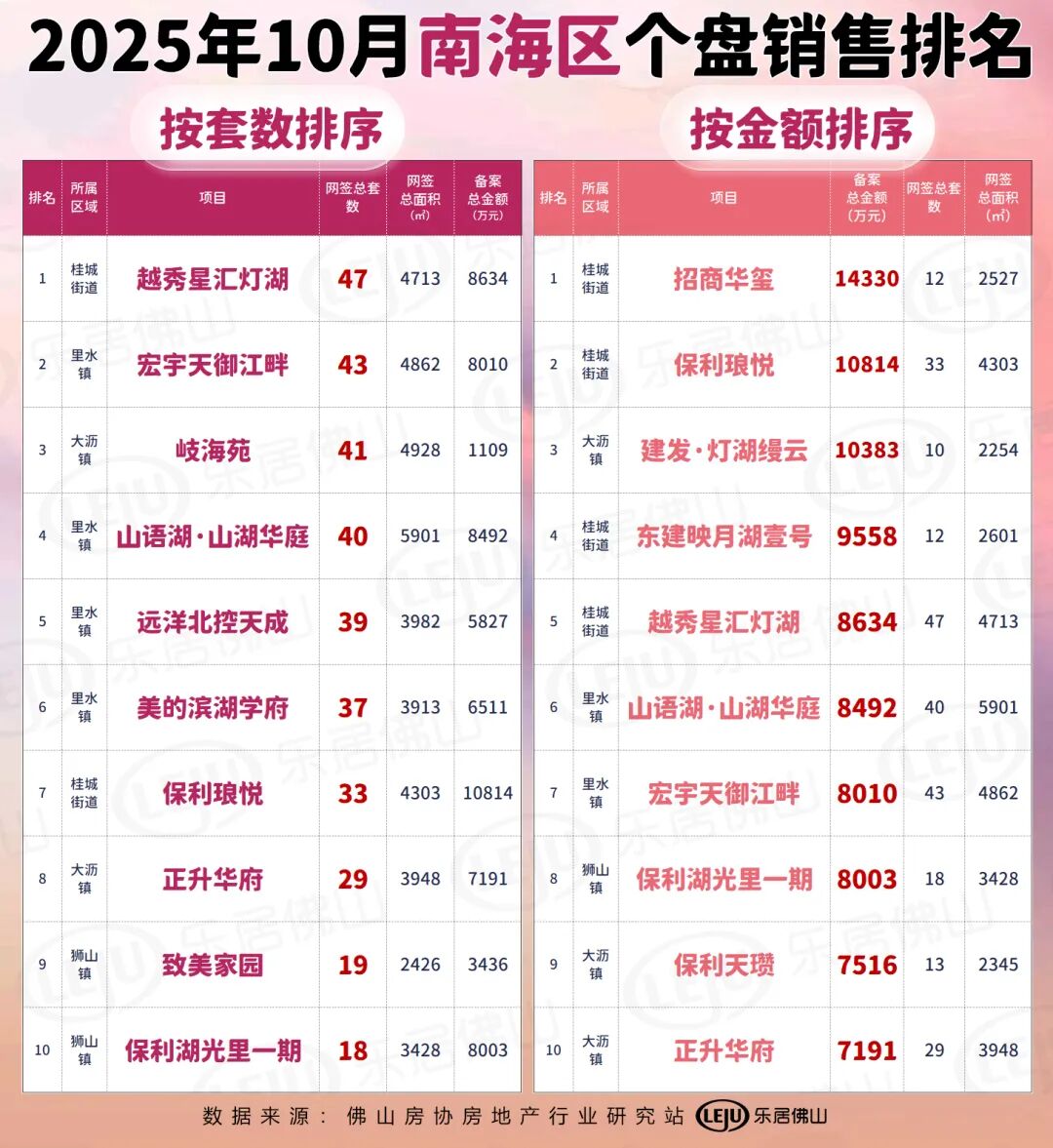 南海区南海方面,表现最好的两个项目均来自千灯湖,金额第一的为招商华玺,而套数第一的则为越秀星汇灯湖。
