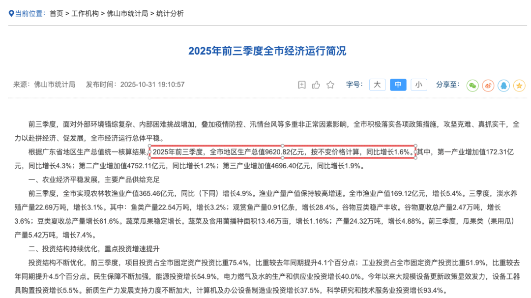 10月31日,佛山统计局公布了2025年前三季度全市经济运行情况。