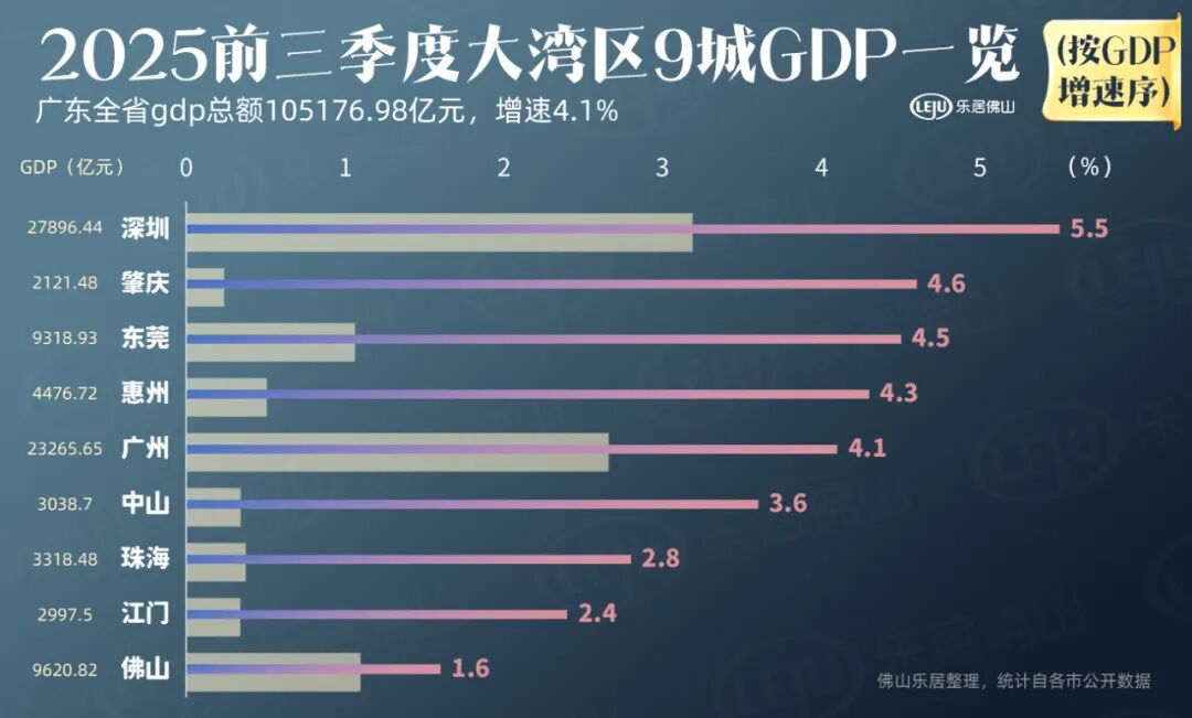 佛山位居第三,达9620.82亿元,增速1.6%;