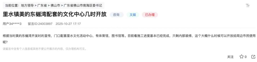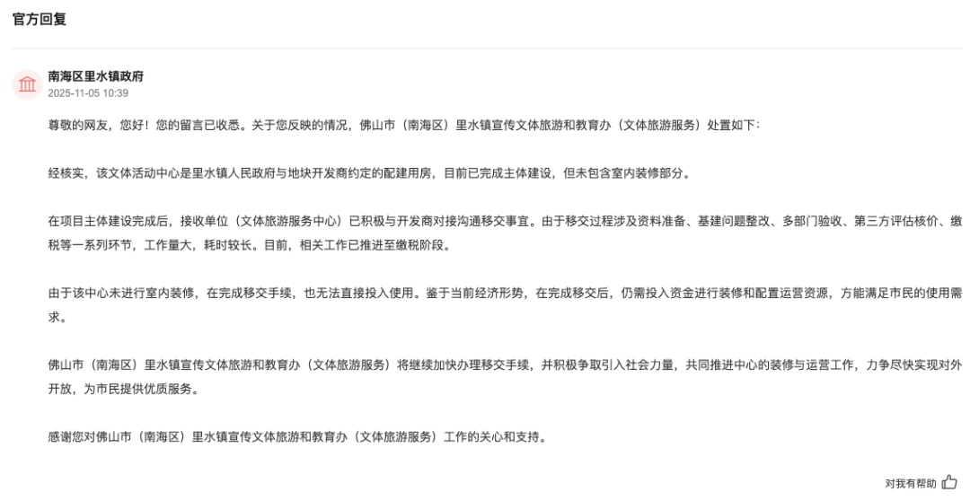 对此,佛山市(南海区)里水镇宣传文体旅游和教育办(文体旅游服务)答复指出,经核实,该文体活动中心是里水镇人民政府与地块开发商约定的配建用房,目前已完成主体建设,但未包含室内装修部分。在项目主体建设完成后,接收单位(文体旅游服务中心)已积极与开发商对接沟通移交事宜。由于移交过程涉及资料准备、基建问题整改、多部门验收、第三方评估核价、缴税等一系列环节,工作量大,耗时较长。