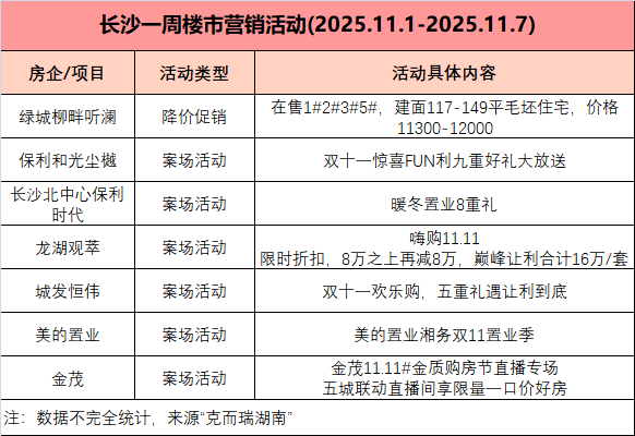2025年11月10日,克而瑞湖南发布了2025年11月第1周(11.1-11.7)的楼市周报数据,"银十"之后成交数据出现了情理之中的大幅下滑,也让我们对市场现状有了深刻的认识。在2025年最后两个月,开发商要想加速去化,必须在自身硬实力和高品质、硬配套的同时,做好营销活动。