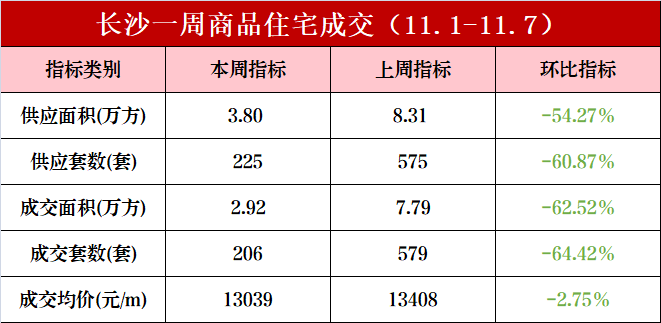 新房市场方面,上周(11.1-11.7)长沙内五区(含高新区、长沙县托管区域)一手住宅成交206套、2.92万方, 成交均价13039元/㎡。供应上,一手住宅新增供应225套、3.80万方。