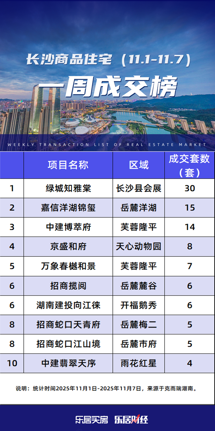 11.1-11.7,长沙内五区哪些楼盘网签成交套数更多?根据克而瑞湖南发布的内五区(含高新区、长沙县托管区域)商品住宅成交榜单显示,绿城知雅棠、嘉信洋湖锦玺、中建博萃府、京盛和府、万象春樾和景、招商揽阅、湖南建投向江徕、招商蛇口天青府、招商蛇口江山境、中建翡翠天序等10个楼盘上榜。榜首成交套数30套,第十名成交4套。