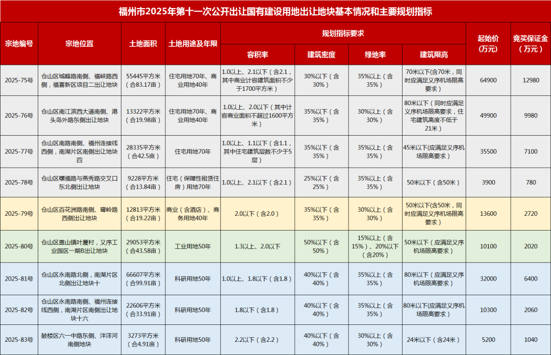 备注:地块出让年限为50年,投资强度为330万元/亩,产业准入类型为智能制造、光电信息、医疗器械、集成电路、高端装备、生物医药、新一代信息技术等上下游相关产业;该地块由竞得人整体持有,允许整体转让、整体抵押,不得分割转让、不得分割抵押;今后土地征迁收储,竞得人应服从搬迁,土地补偿按土地权证用途评估价和本次土地出让成交价孰低原则进行补偿,建筑物、构筑物按重置价结合成新率补偿;竞得人在签订土地出让合同的同时,须与仓山区人民政府签订履约监管协议。