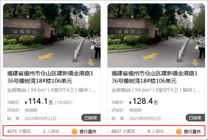 事实上,“银行直供房”除了商业产权房产外,也不乏住宅产品上架拍卖。今年9月21日,位于仓山区建新镇金港路橡树湾(现名:金辉枫尚)小区底价成交了一套94.6㎡的住宅,总价约114.1万,折合单价约12061元/㎡。