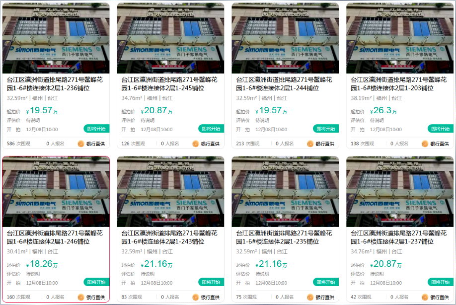 而福建海峡银行福州洪山支行则上架了8套位于台江区排尾路鳌峰花园2层店面,面价30.41㎡-38.19㎡,总价18.26万-26.3万,单价6005元/㎡-6887元/㎡之间。