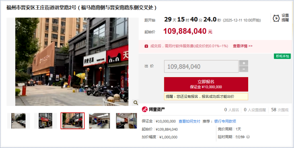 此外,福建海峡银行福州东大支行上架利嘉城A区地下1层一套约36㎡店面,起拍价39.91万;福州五一支行上架一套闽清县梅城镇解放大街广宇A区二层395.66㎡店面,起拍价约268万;福州鼓楼支行则上架了台江元洪锦江二期一套地下1层185.1㎡店面,起拍价约202万。