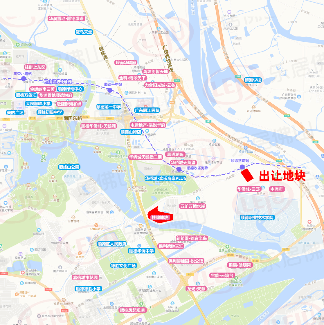 从宗地位置来看,该地块就位于顺德大良东部新城板块,紧邻佛山地铁3号线顺德学院站,目前片区已开发有华侨城云邸、中洲府和五矿万境水岸等住宅项目。