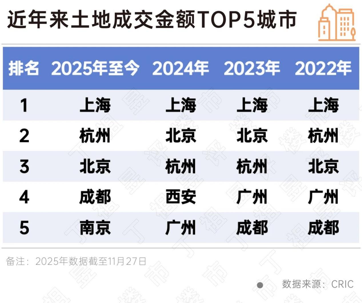 CRIC数据显示,截至2025年11月27日,全国土地成交金额已超2.2万亿元,虽然总成交金额较2024年同期有所下降,但有6个城市成交金额超500亿元,分别为上海、杭州、北京、成都、南京、西安。