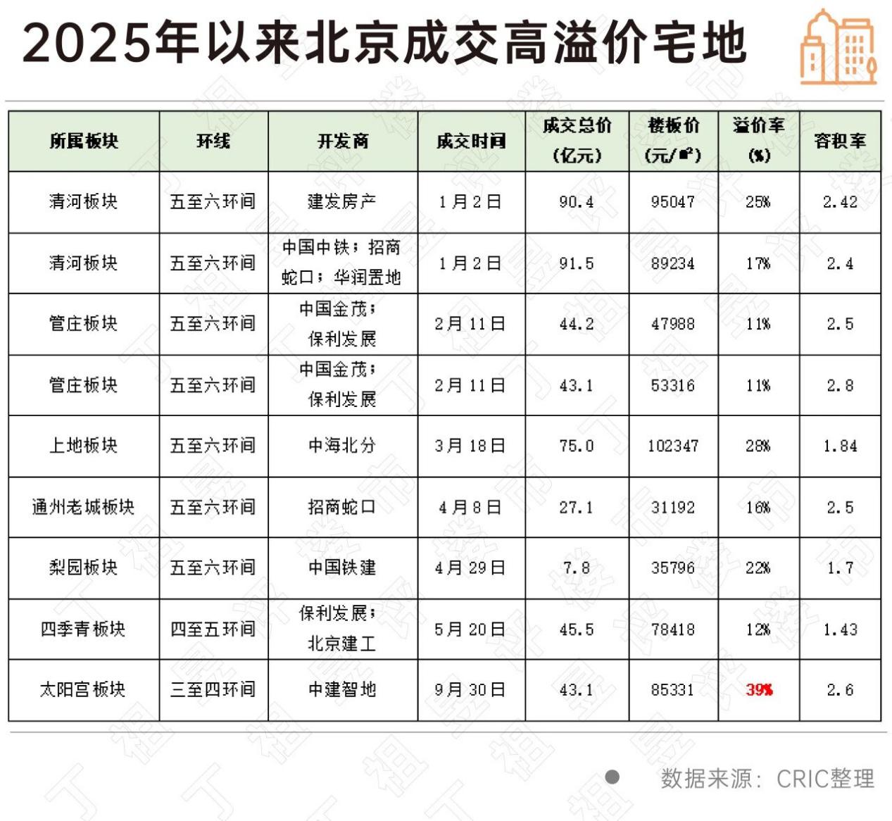 2025年以来已经有9宗住宅用地溢价率超过10%,其中9月30日出让的太阳宫宅地溢价率更是高达39%,该地块在9家房企339轮竞价后,由中建智地以43.1亿元竞得,溢价率39.2%,平均楼板价8.5万元/平方米,地块容积率由此前的3.0调整至2.6,周边可比房价为12万元/平方米左右。