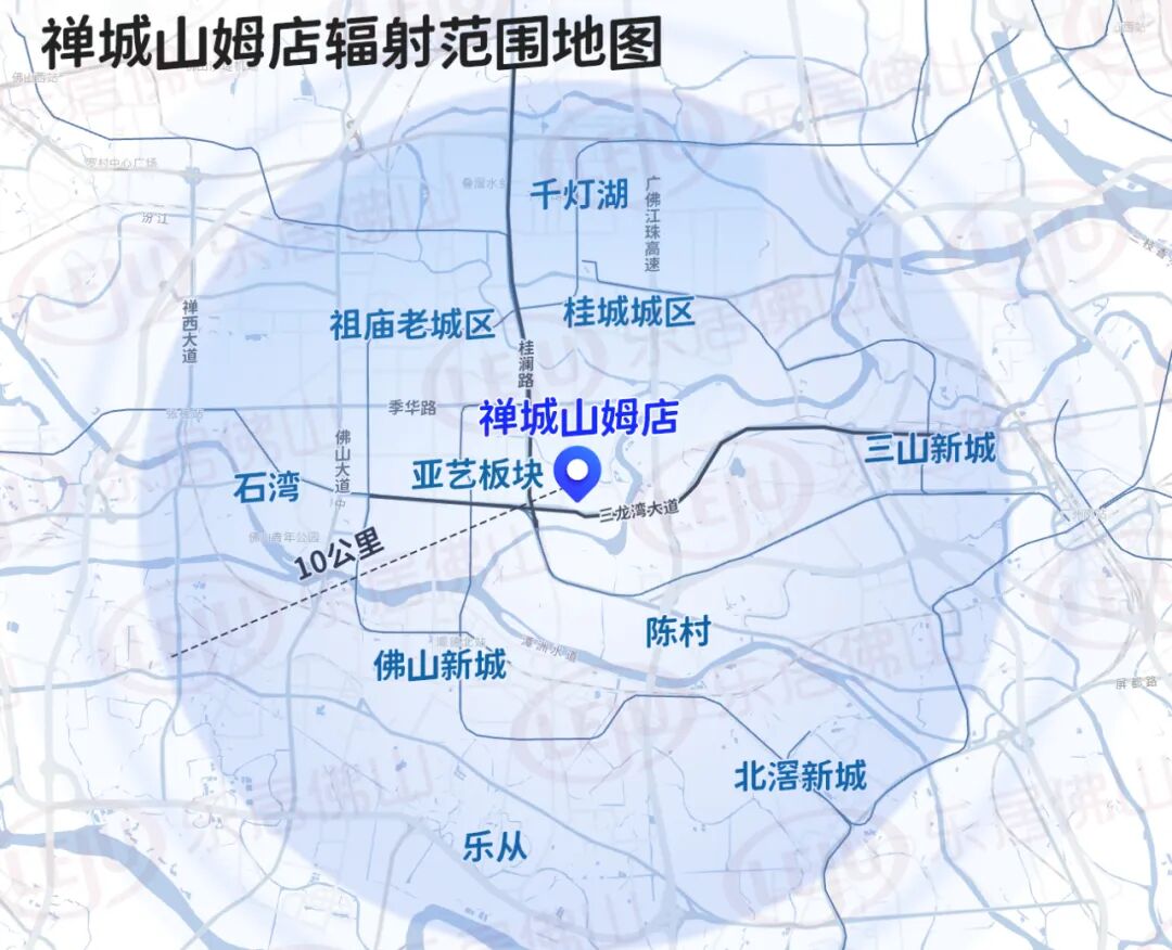 而选址于奇槎板块的禅城山姆店,周边十公里内人口密集,包括祖庙、石湾、张槎、南庄、桂城城区以及乐从、北滘、陈村等,可辐射近300万人,与顺德山姆店的区域辐射范围和客群形成一定的互补。