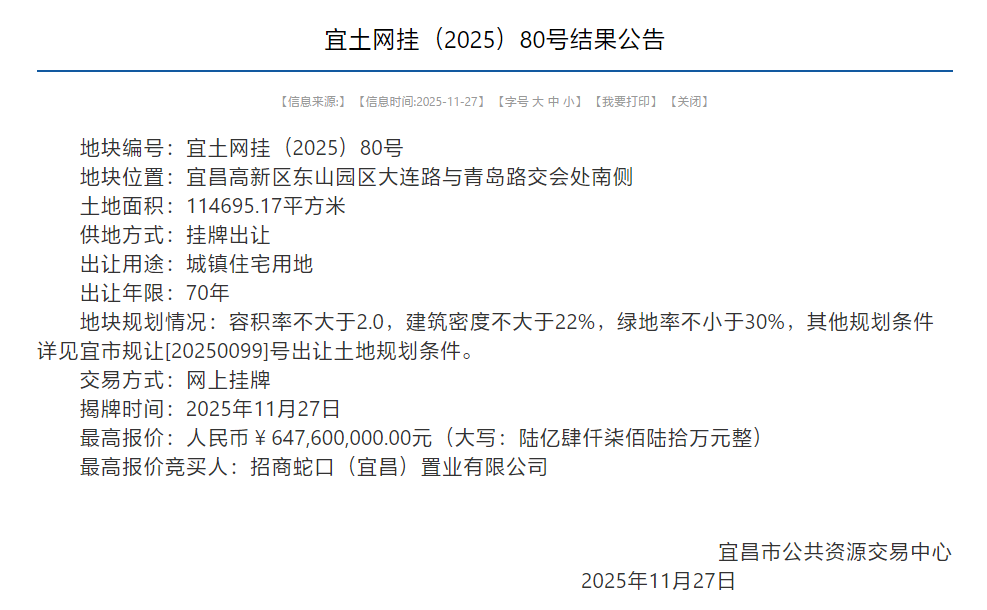 11月27日,宜土网挂(2025)80号地块拍卖结果公示!