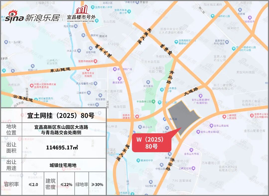 ①宜土网挂(2025)80号地块位于宜昌高新区东山园区大连路与青岛路交会处南侧。