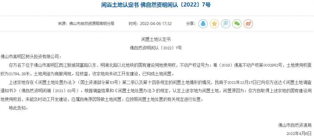 但此后该项目就一直没有了下文,直到2022年宗地传出闲置消息。官方公示的闲置原因为佛山市高明区树头投资有限公司取得上述宗地的国有建设用地使用权后,未能及时动工开发建设,应属自身原因导致土地闲置。